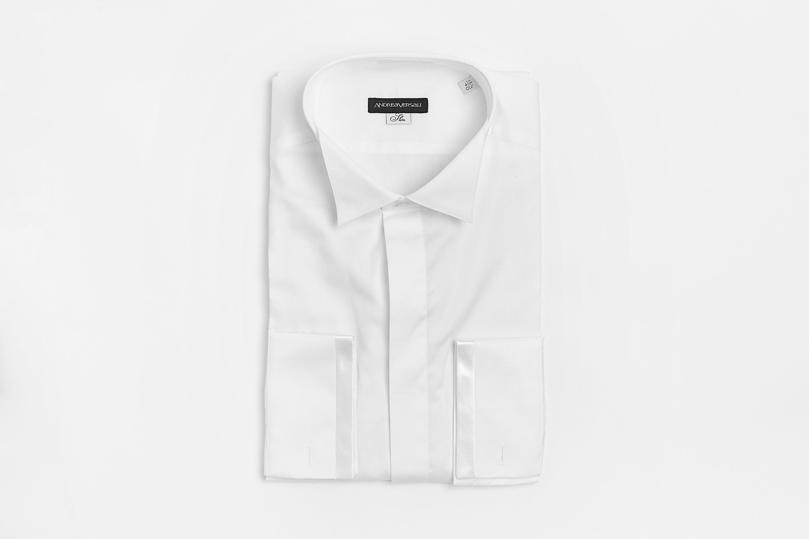 The refined satin piping on the cuffs and placket adds a touch of discreet brilliance, perfect for enhancing tuxedos and groom suits.