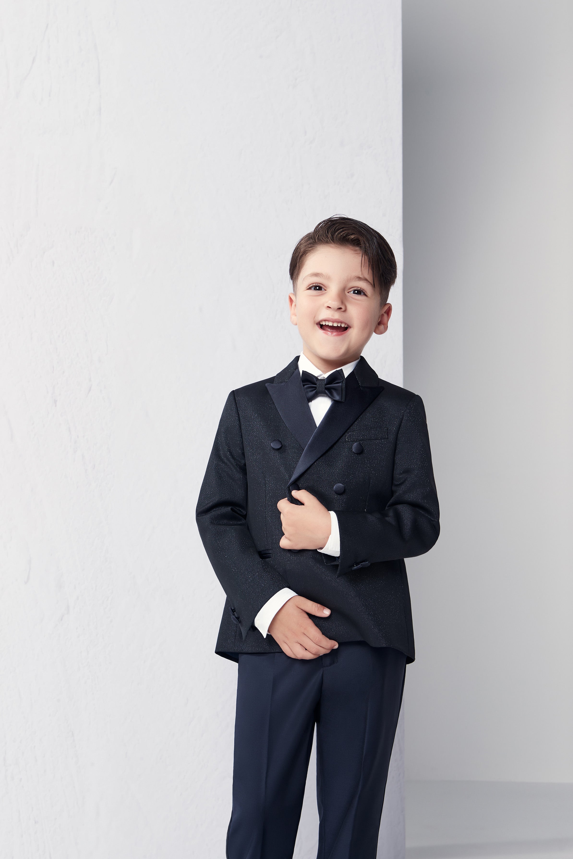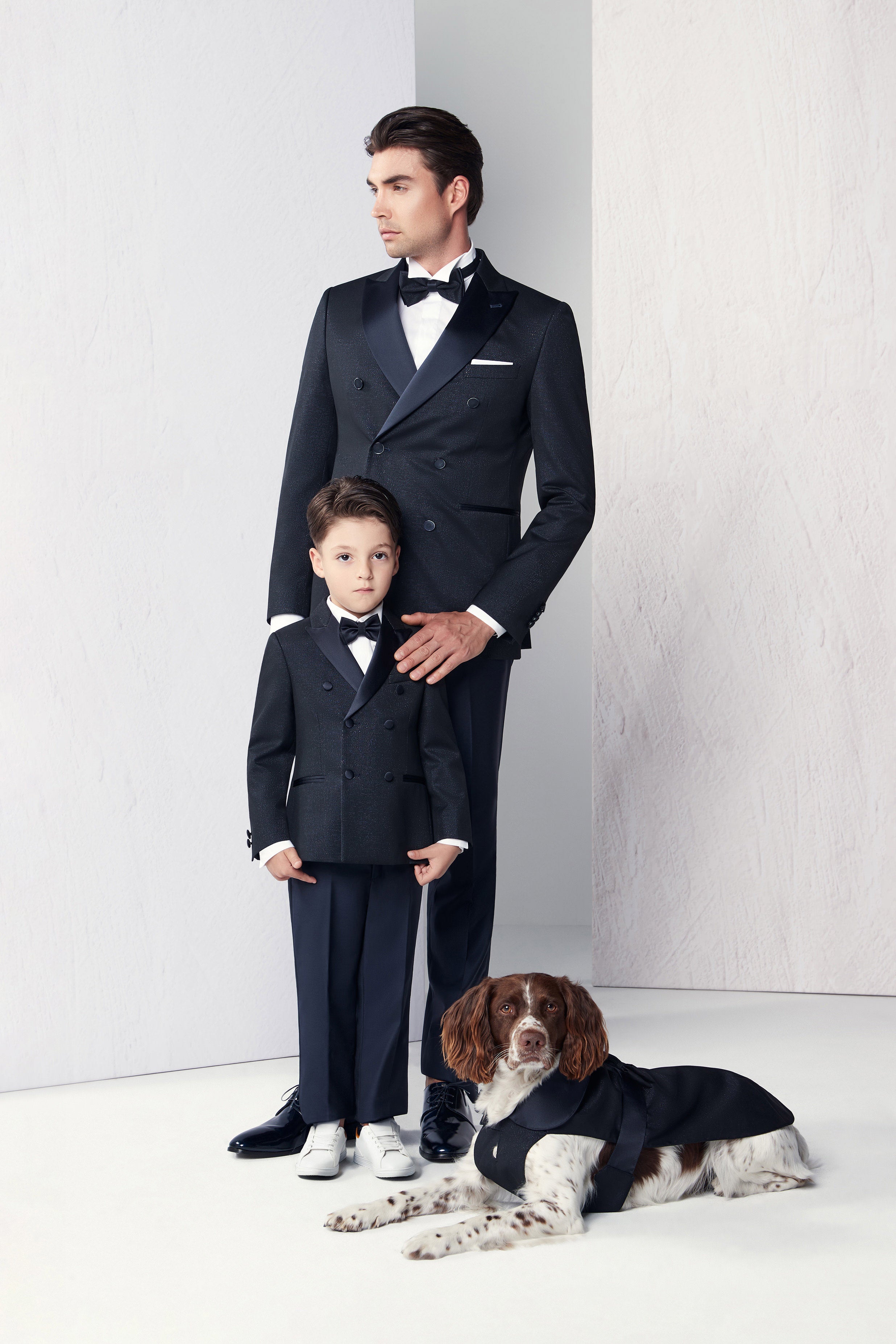 An exclusive look that highlights coordinated elegance. The men's double-breasted suit with satin peak lapels is available in the same fabric for the children's version and the pet accessory. A refined and harmonious ensemble, ideal for ceremonies and special events, where style and family merge into a single, classy image.