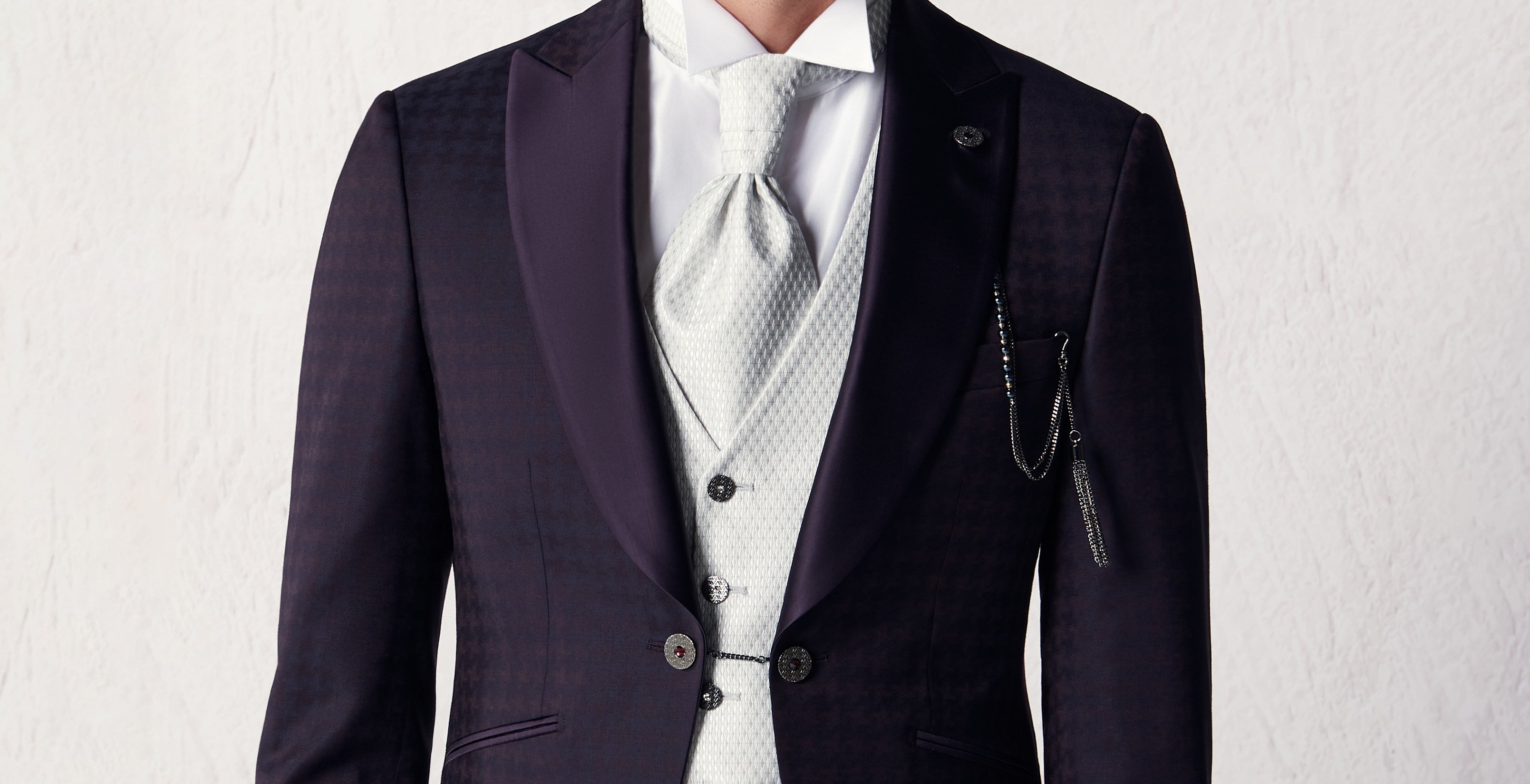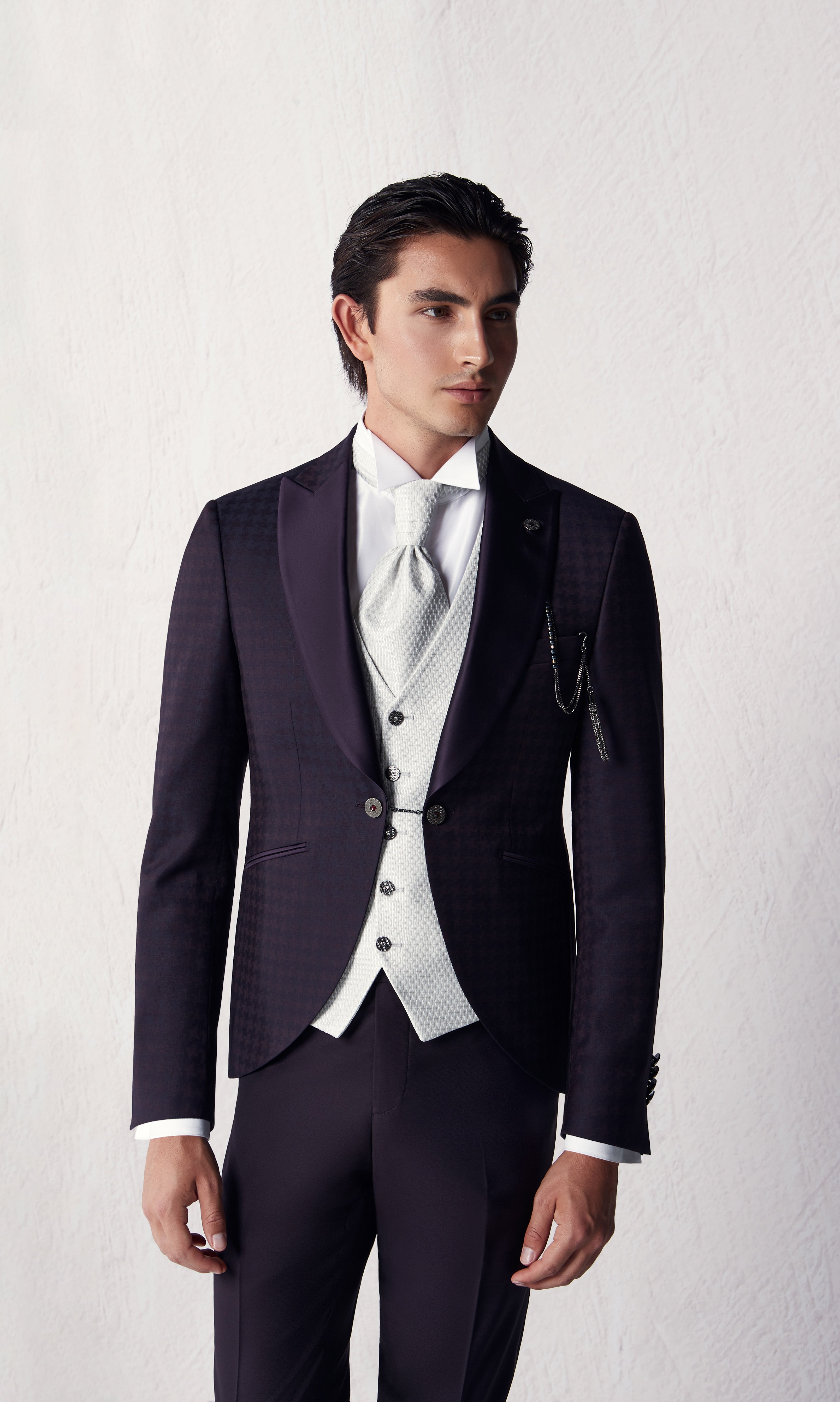 A suit with a strong personality that combines classic elegance and sophisticated details. The jacket is crafted from a refined wine blue fabric with a tone-on-tone micro-geometric pattern, enhanced by shiny satin lapels that lend depth and prestige. The five-button vest in light fabric with a micro-pattern and the matching tie brighten the ensemble, creating an elegant and sophisticated contrast. The chain accessory inserted in the pocket adds a touch of sartorial character, perfect for those seeking a distinctive and contemporary style.