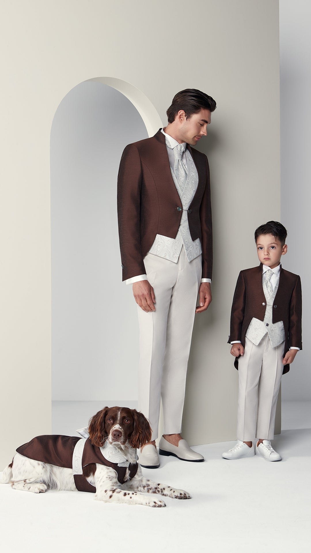 A refined ensemble that interprets elegance as a shared experience. The long brown jacket, with a modern and ceremonial cut, pairs with the pearl waistcoat and plastron with a damask motif, creating a contrast rich in personality. The same style is expressed in the kids' version, which faithfully reproduces the sartorial details for a look both refined and tender. The outfit is completed with a matching pet accessory, made from the same fine fabrics, for a harmonious and exclusive family image. An ideal proposal for those who wish to experience the ceremony with coherence, elegance, and an unforgettable touch of originality.