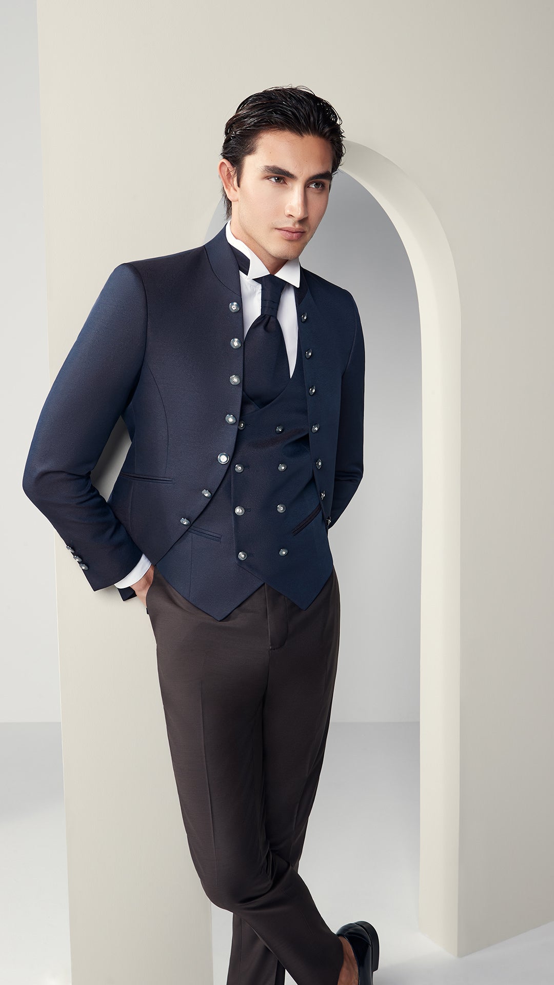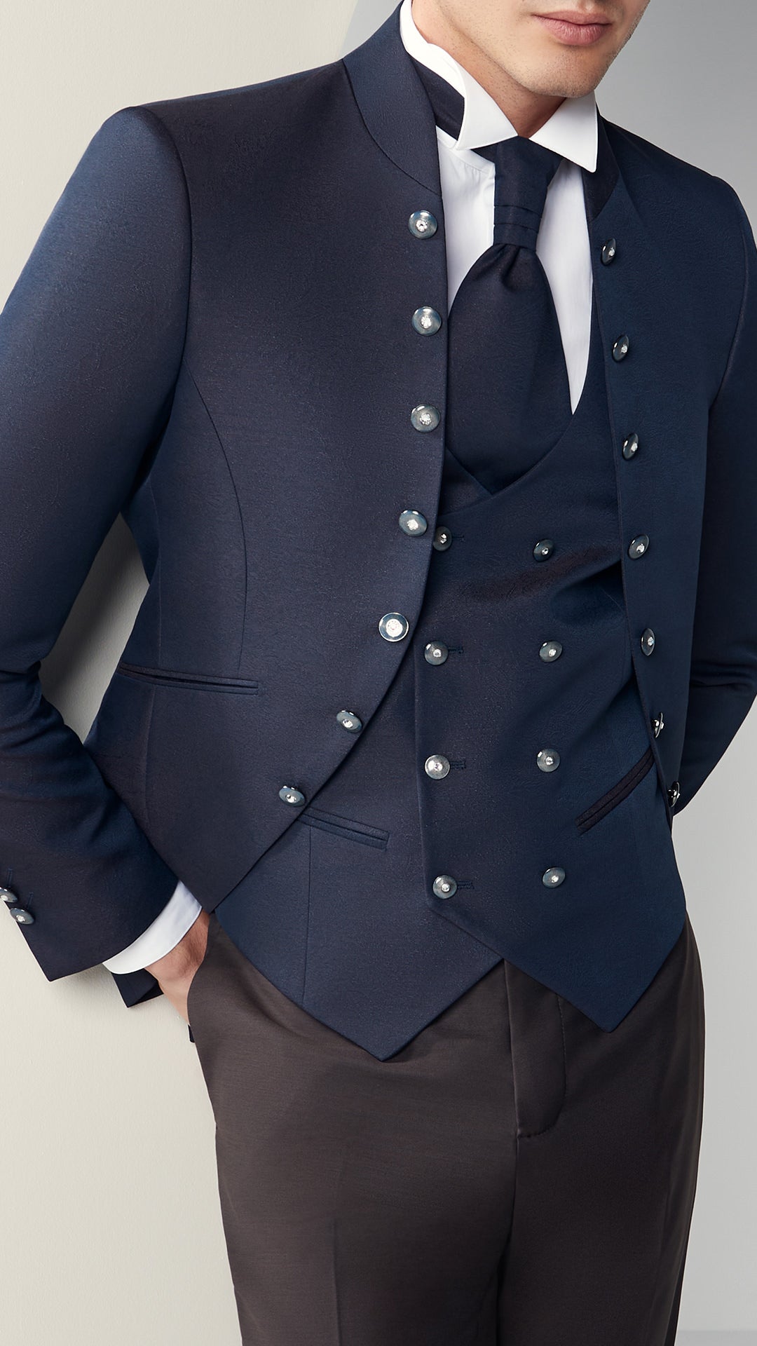 A sophisticated and contemporary wedding suit. The midnight blue jacket, slightly long and embellished with a double row of decorative buttons, features a mandarin collar that emphasizes its elegant and distinctive character. The matching vest and plastron tie complete the ensemble with harmony and refinement. A look designed for the groom who desires refined elegance, capable of combining tradition and modernity with impeccable balance.