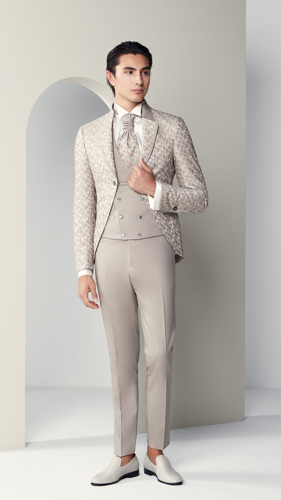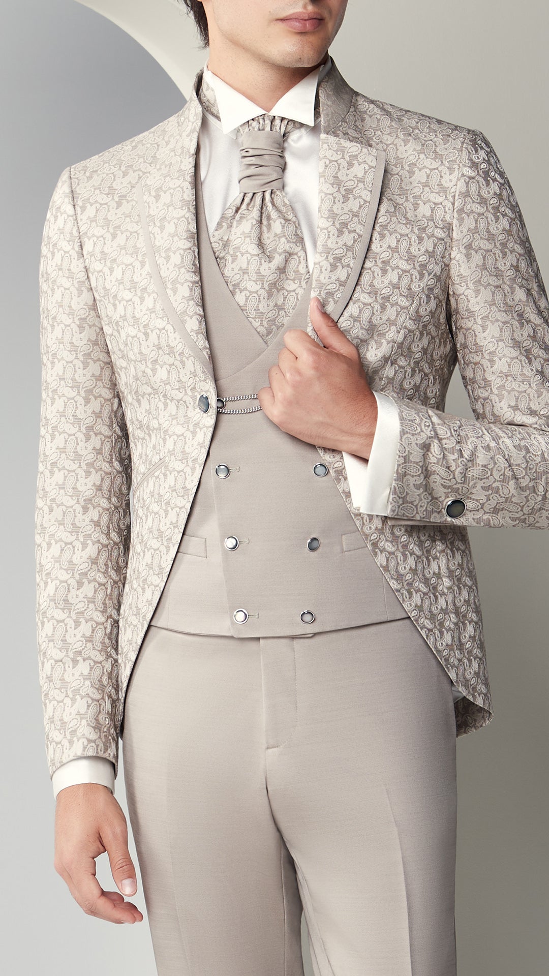 A strikingly elegant suit, featuring a damask jacket in natural tones with contrasting lapels and a mandarin collar. The matching double-breasted vest and plastron tie create a harmonious ensemble that highlights the refined details. The clean lines and tailored workmanship make this suit a distinctive choice, perfect for those seeking a sophisticated and impactful look for the most exclusive formal occasions.