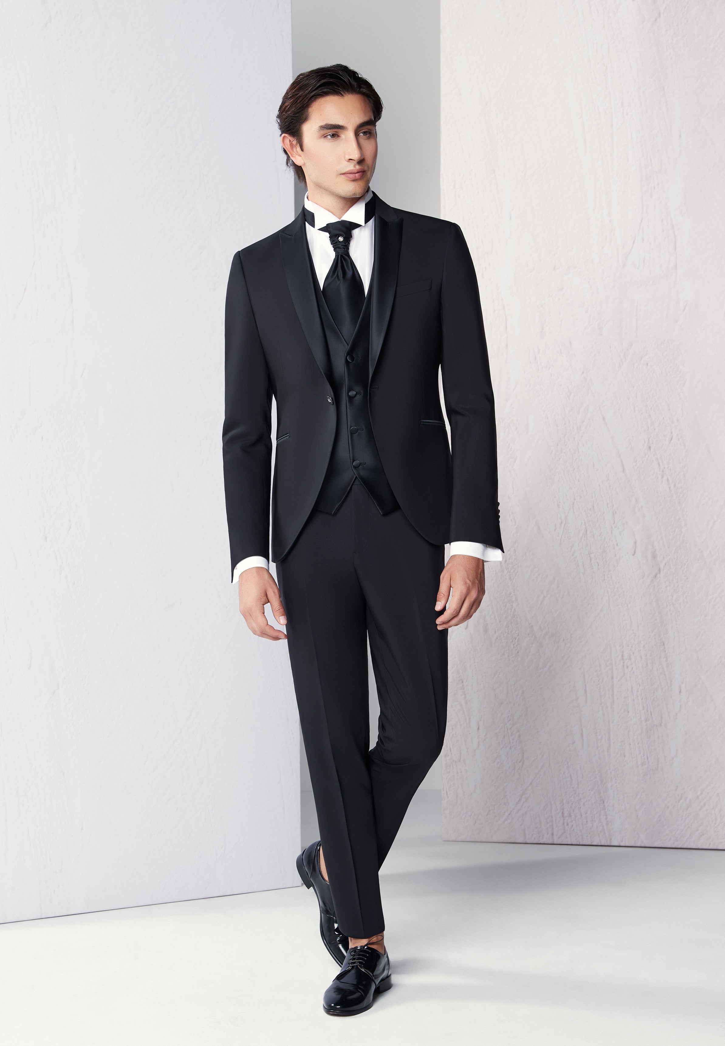An elegant and decisive black suit, featuring a single-breasted jacket and satin peak lapels that add a touch of refinement to the clean lines. The matching waistcoat and matching tie complete the look, perfect for ceremonies and formal events that demand class and timeless style.