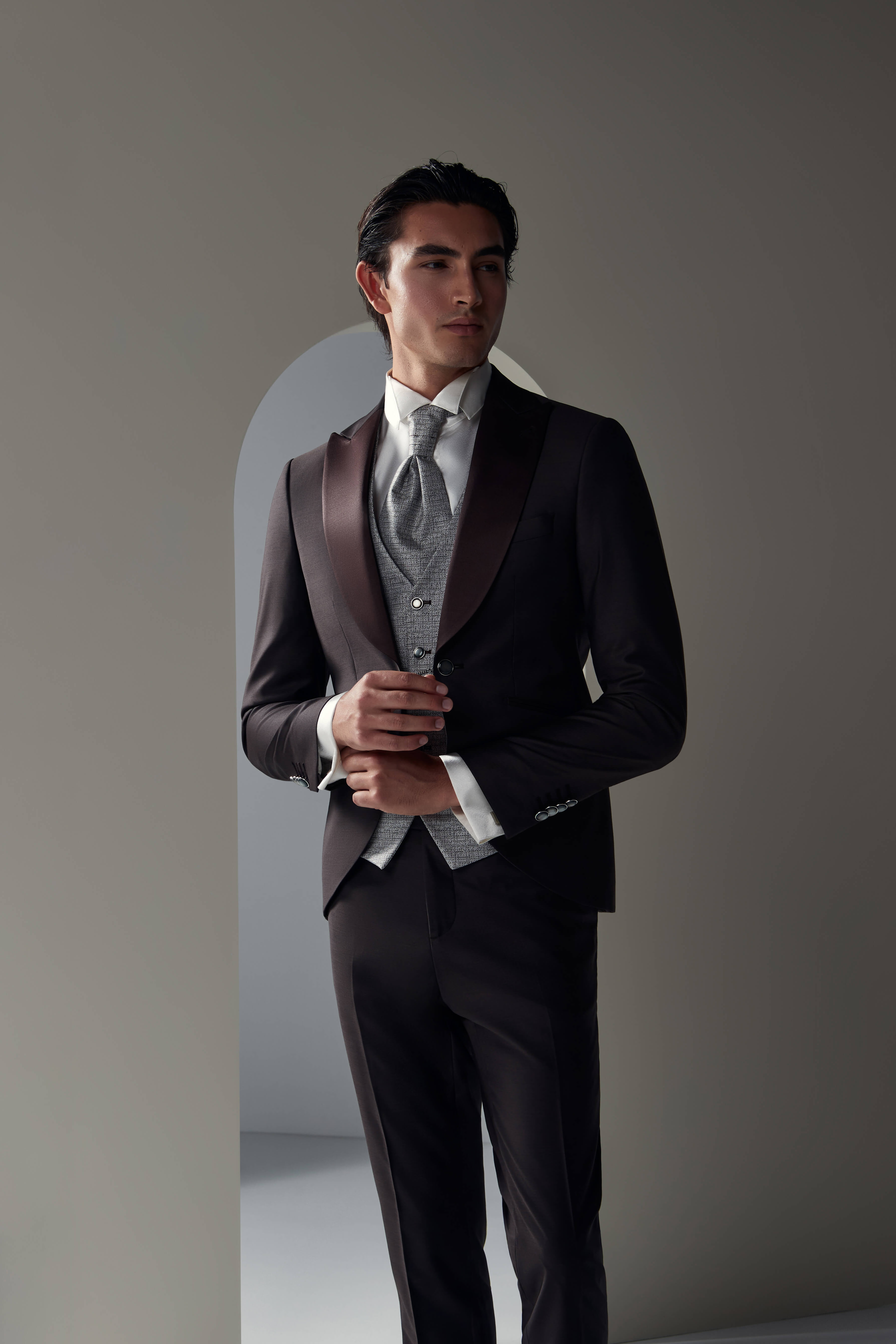 Warm and refined elegance in shades of brown. The tailored single-breasted jacket is embellished with contrasting lapels, perfectly paired with the light gray vest and matching plastron tie. The clean lines and sophisticated details give the groom a contemporary elegance without sacrificing tradition. A suit that celebrates personality and style on the most important day.