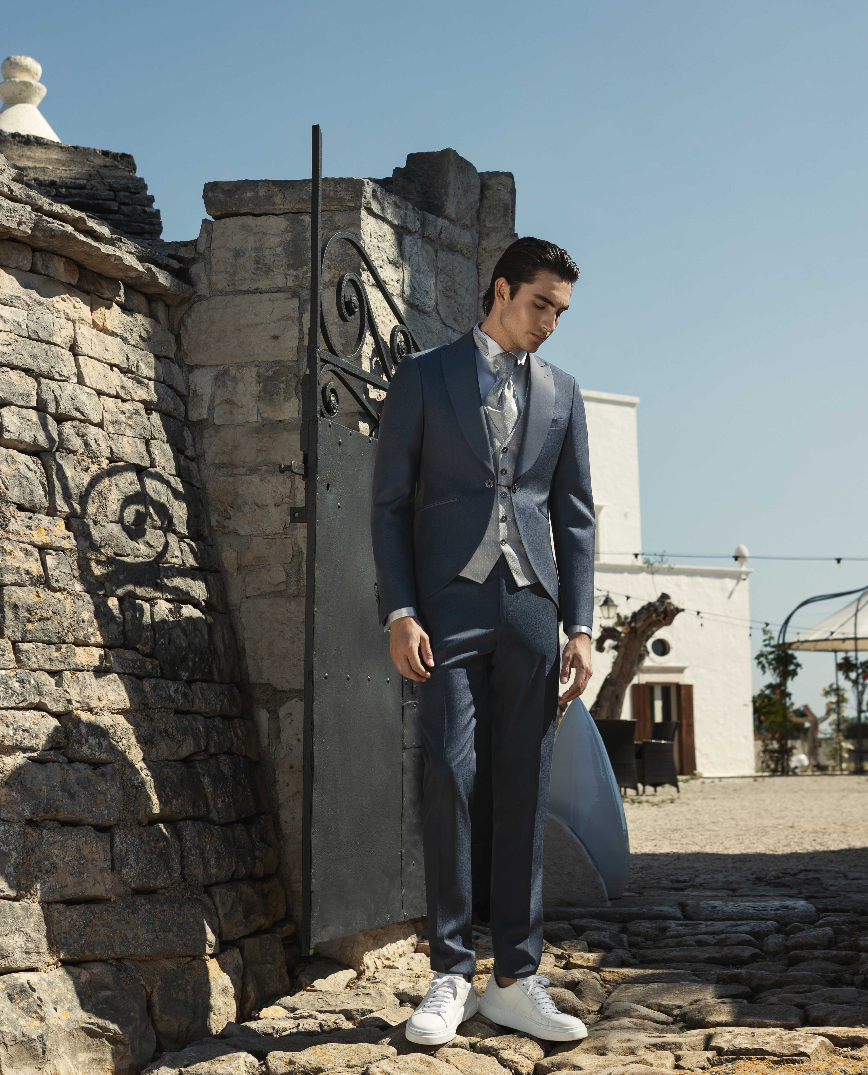A suit that blends sartorial tradition and modernity. The powder blue suit stands out for the impeccable cut of the single-breasted jacket, paired with a pearl gray waistcoat and a matching ascot tie. The refined details and flowing fit enhance the silhouette, giving the groom a natural and timeless elegance. A sophisticated look, designed for those who want to celebrate their special day with style and personality.