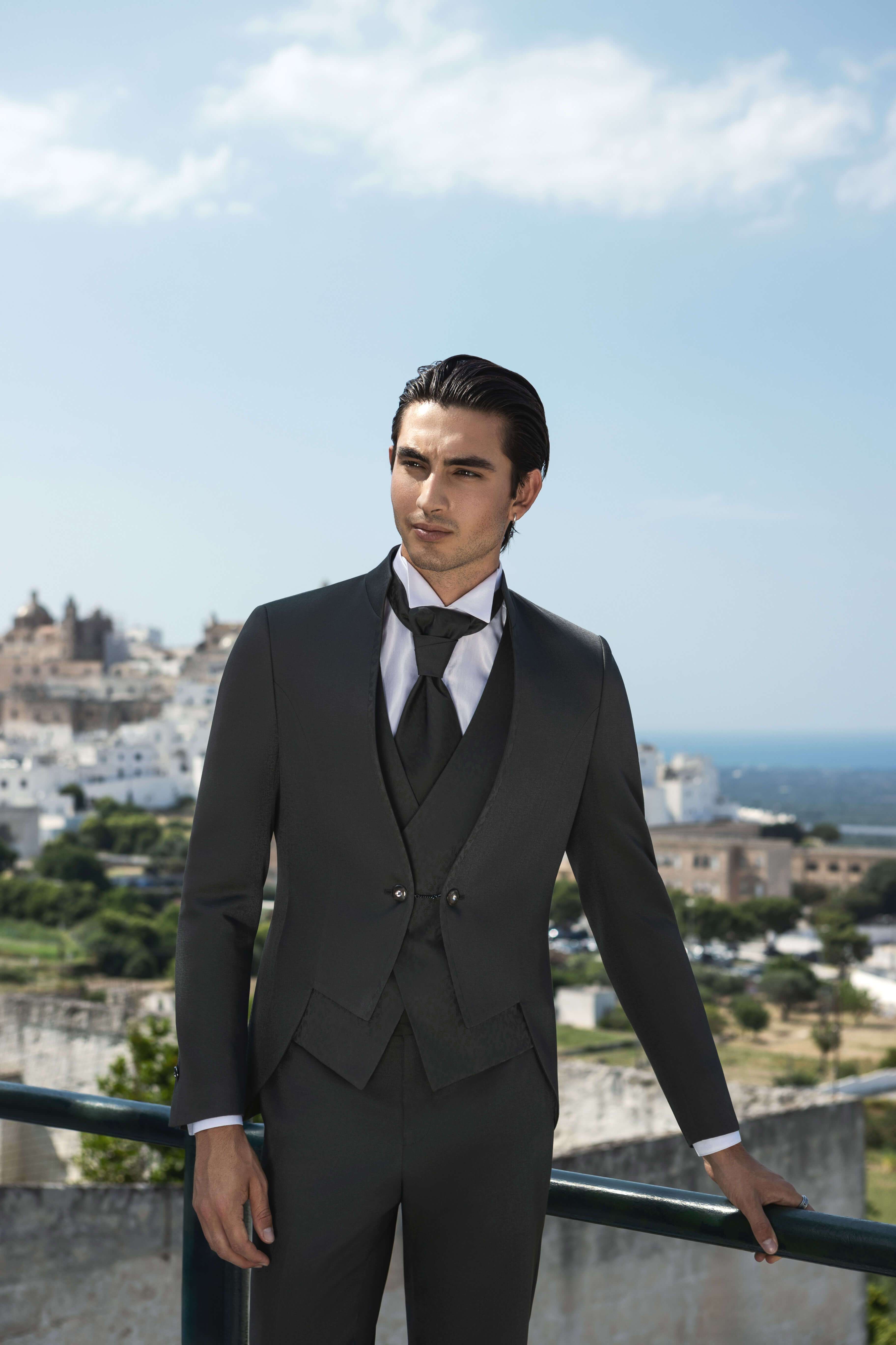 A suit with a contemporary appeal that combines elegance and personality. The slim, modern jacket features damask inserts and a chain-link button closure. The jacquard-patterned waistcoat and matching formal tie create a refined interplay of textures, striking a perfect balance between sobriety and sophistication. An ideal look for those who want to stand out with style, suitable for both the groom and the guest looking to make a statement on a special occasion.