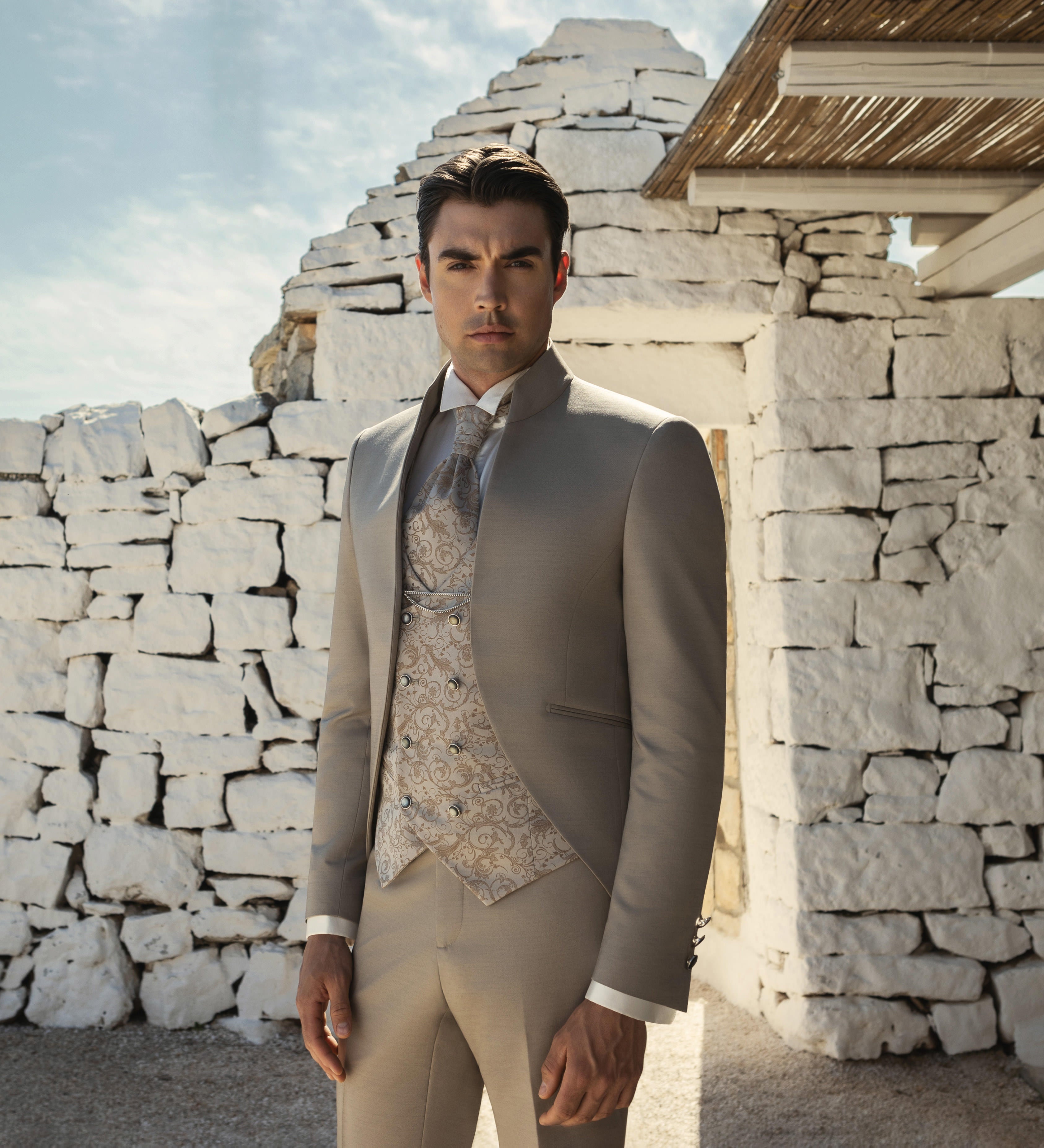 A refined suit in beige tones, which interprets elegance with brightness and style. The open jacket with a modern cut and g The hidden jewel and double chain are paired with a baroque-patterned damask waistcoat and a matching plastron tie for a sophisticated and dramatic effect. The slim fit and tailored details give the groom a refined and contemporary look, ideal for those who want to stand out with elegance in a unique wedding atmosphere.