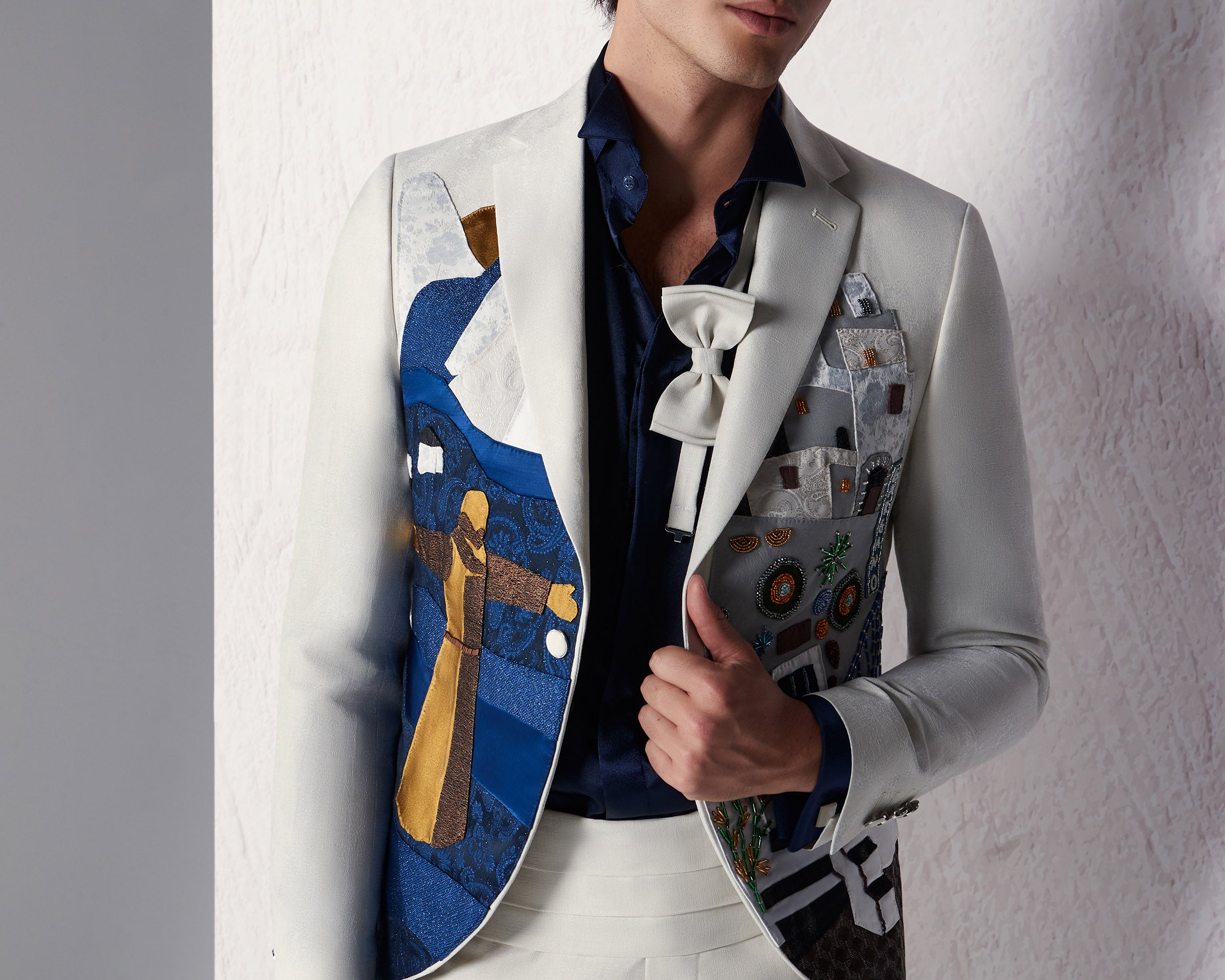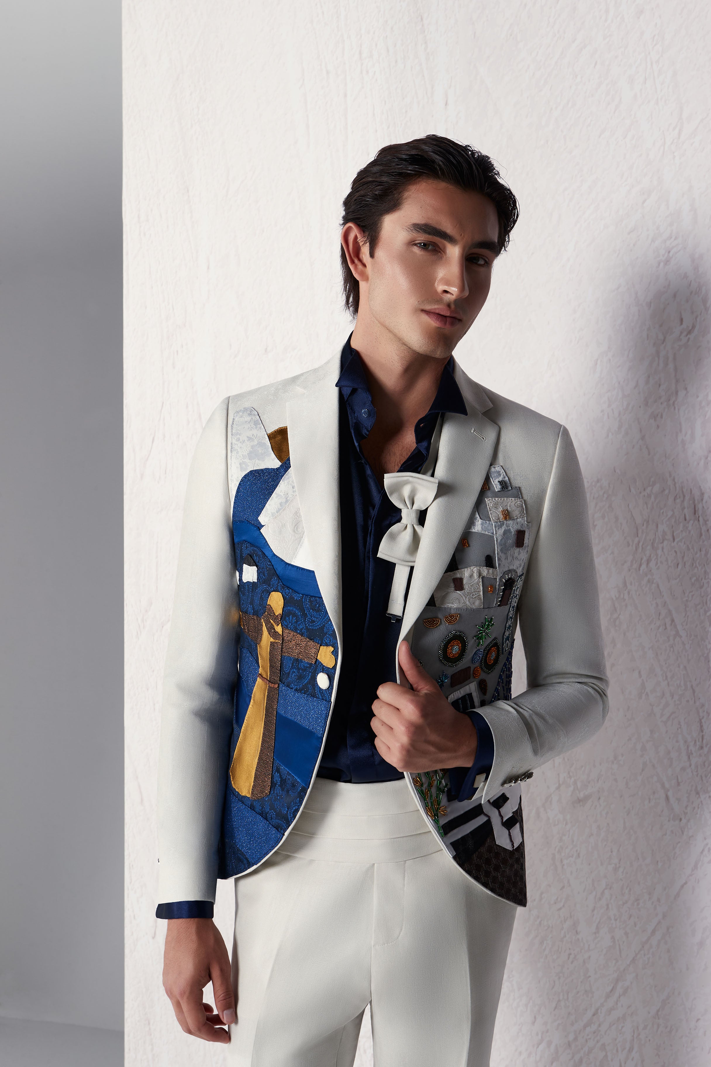 An exclusive suit that pays homage to the Gargano region with a unique and dramatic design. The light-colored jacket is embellished with artistic appliqués and embroidery depicting landscapes and symbols of Puglia's tradition, transforming it into a visually striking piece of haute couture. The ivory trousers and dark shirt create a refined play of contrasts, completing a signature look perfect for prestigious ceremonies and events.
