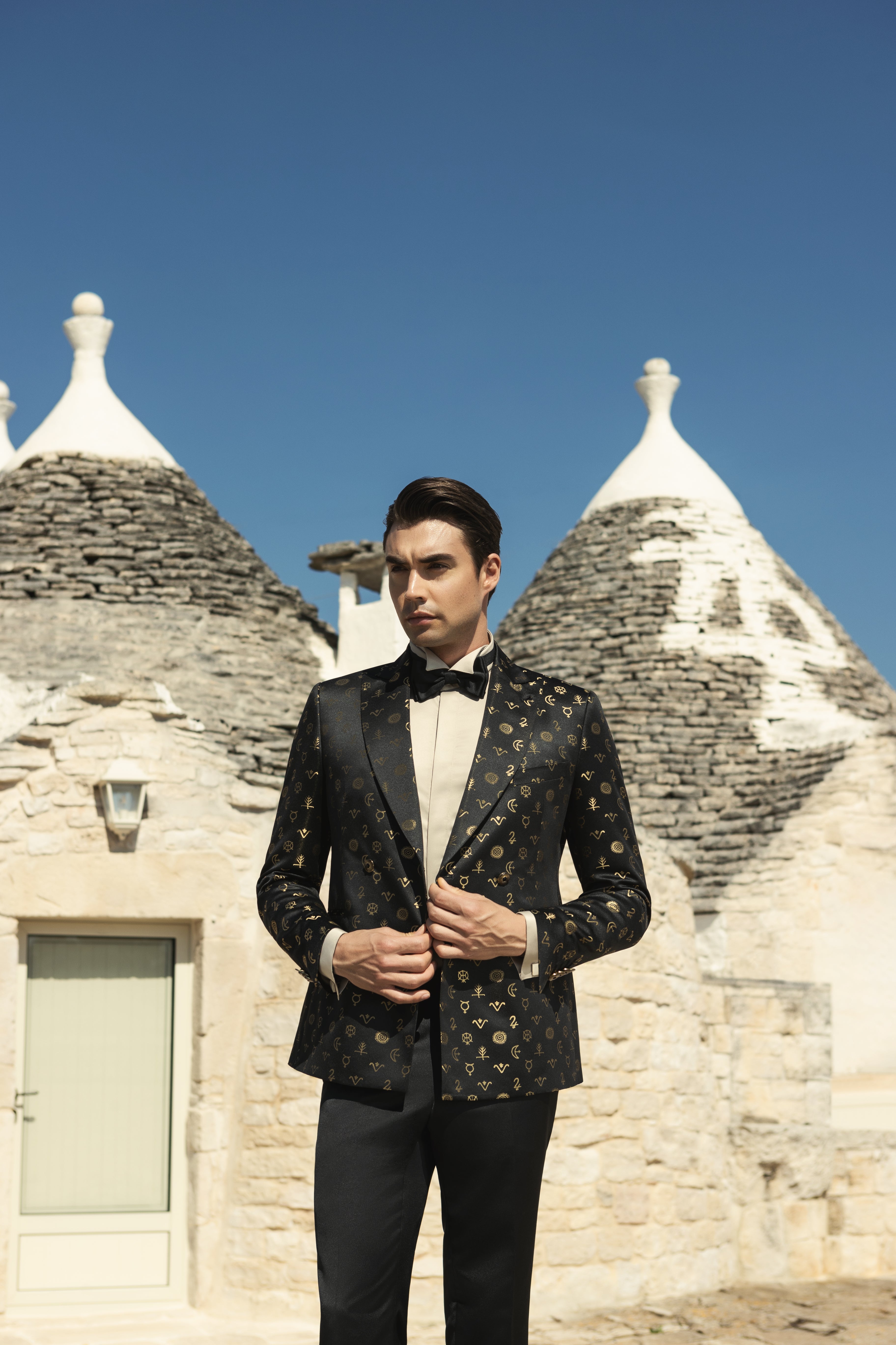 The "Symboli" jacket celebrates one of Puglia's most evocative traditions: the mysterious symbols found on the roofs of Alberobello's trulli. These energetic symbols, drawn from astrology, ancestral cultures, and the influence of the planets, were intended to protect the environment from negative influences and bring good luck. The refined damask of this jacket faithfully reproduces these emblems, paying homage to this ancient and fascinating popular belief.
