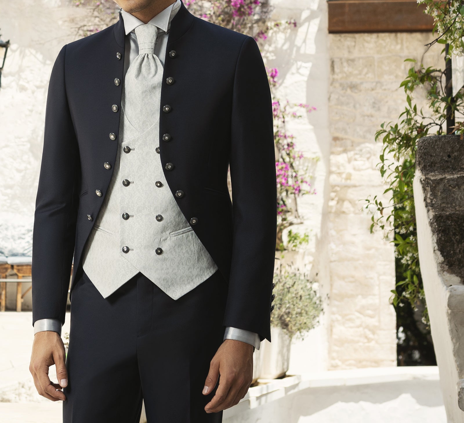 Un abito da cerimonia dallo stile regale e contemporaneo, caratterizzato da una giacca lunga blu notte con abbottonatura doppia a file parallele e colletto alla coreana. Il gilet chiaro con motivo damascato e la cravatta plastron coordinata creano un contrasto elegante che dona luminosità all’insieme. I dettagli metallici dei bottoni sottolineano l’equilibrio tra tradizione e modernità , per un look che esprime carisma e autorevolezza, ideale per uno sposo che desidera distinguersi con raffinatezza.