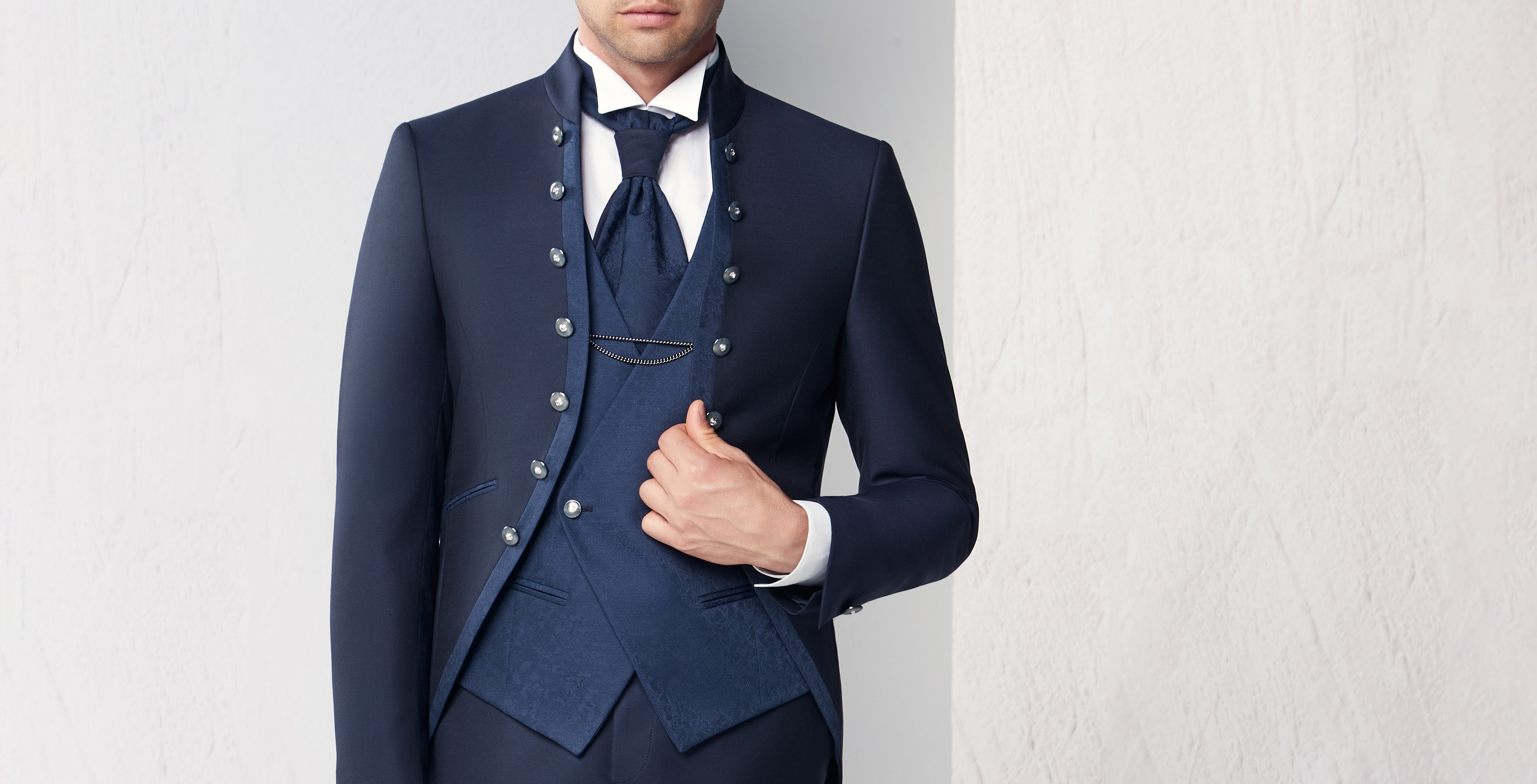 Un completo esclusivo in blu intenso, definito da una giacca a collo coreana con bottoni gioiello a vista che ne valorizzano il carattere sofisticato con catena decorativa. Il gilet coordinato e il plastron tono su tono donano equilibrio e ricercatezza al look. Il taglio asciutto dei pantaloni completa l’insieme con un tocco moderno, rendendo questo abito ideale per chi desidera un’eleganza distinta e senza tempo nelle occasioni speciali.